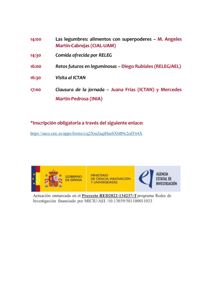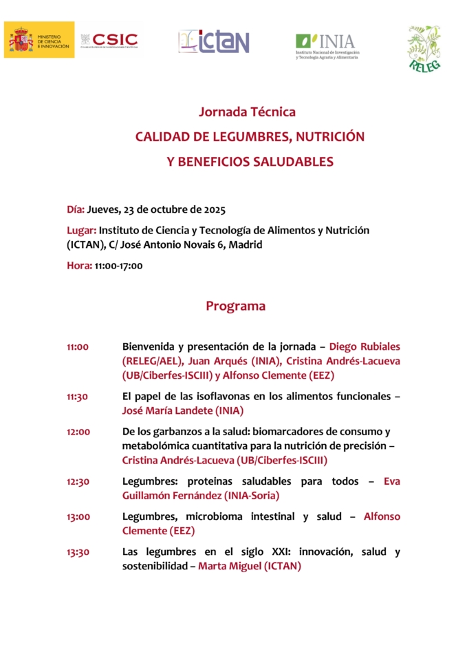 Ya anunciada informalmente hace unos meses por su organizadoras (Dra. Juana Frías de ICTAN y Dra. Mercedes Martín-Pedrosa de INIA), se establece cita definitiva en el próximo 23 de octubre y el escenario serán las instalaciones del ICTAN en la capital madrileña. La Jornada, que tendrá lugar de 11 a 17h, abarcará una apreciable diversidad de temáticas dentro del área, desde macro- y micronutrientes en las leguminosas de consumo, alimentos funcionales y salud, hasta las visiones más innovadoras y perspectivas futuras. La jornada incluirá además, una visita a las instalaciones del centro, como viene siendo habitual en este tipo de jornadas presenciales. Puede descarga aquí el programa detallado en pdf.